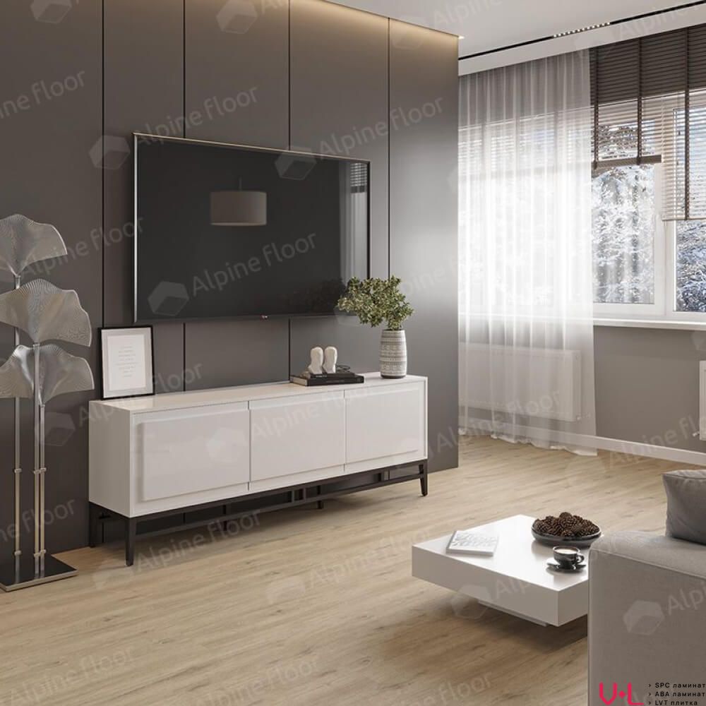 Дизайн SPC ламината Alpine Floor Solo Plus Анданте имитирует натуральное дерево, создавая уютную атмосферу в любом помещении. Также этот ламинат имеет синхронное тиснение, благодаря которому текстура поверхности и рисунок совпадают, добавляя реалистичности внешнему виду пола.
