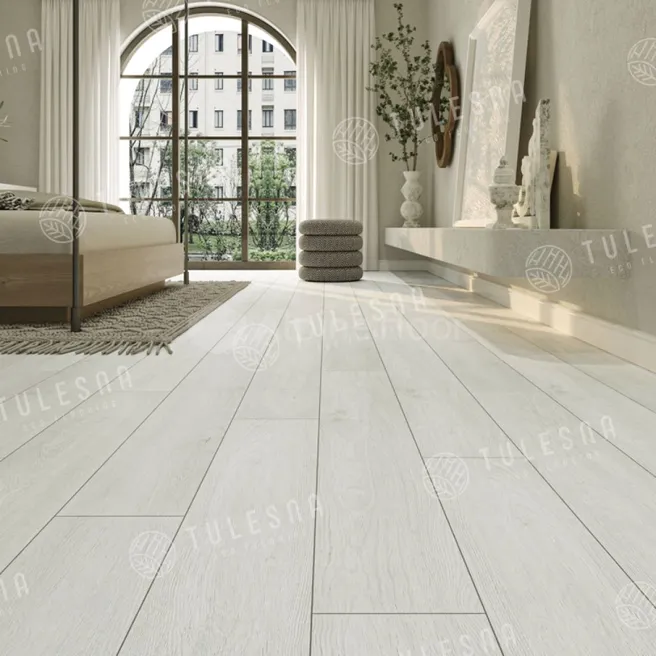 Структурированная поверхность, повторяющая рисунок дерева, придаёт покрытию эстетичный внешний вид. Светлый оттенок делает ламинат подходящим для интерьеров в разных стилях, включая современные. Наличие фаски по периметру досок создаёт эффект массивного пола.