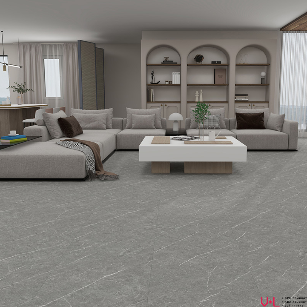 Покрытие выполнено из прочного материала SPC (Stone Polymer Composite), толщина которого составляет 4.3 мм. Класс износостойкости ламината – 34, что гарантирует его долговечность и устойчивость к истиранию. Ламинат имеет серый цвет и дизайн под камень, который добавляет помещению элегантности и стиля.