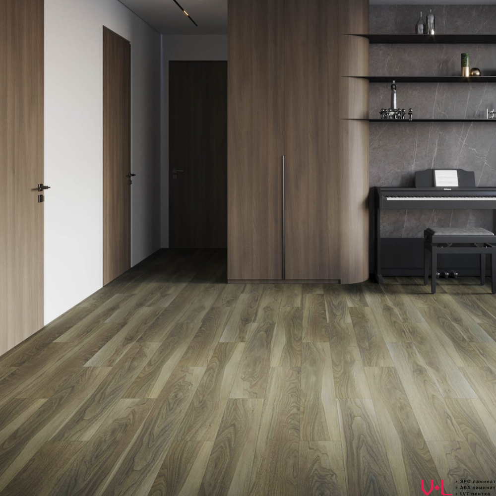 Покрытие точно имитирует текстуру дерева и напоминает по внешнему виду натуральный орех. Благодаря синхронному тиснению, рисунок совпадает с текстурой плитки, создавая эффект натурального деревянного пола. Изделие подойдёт для таких помещений, как кухня, спальня, гостиная, детская, коридор, ванная или офис. Покрытие устойчиво к царапинам и воздействию влаги.