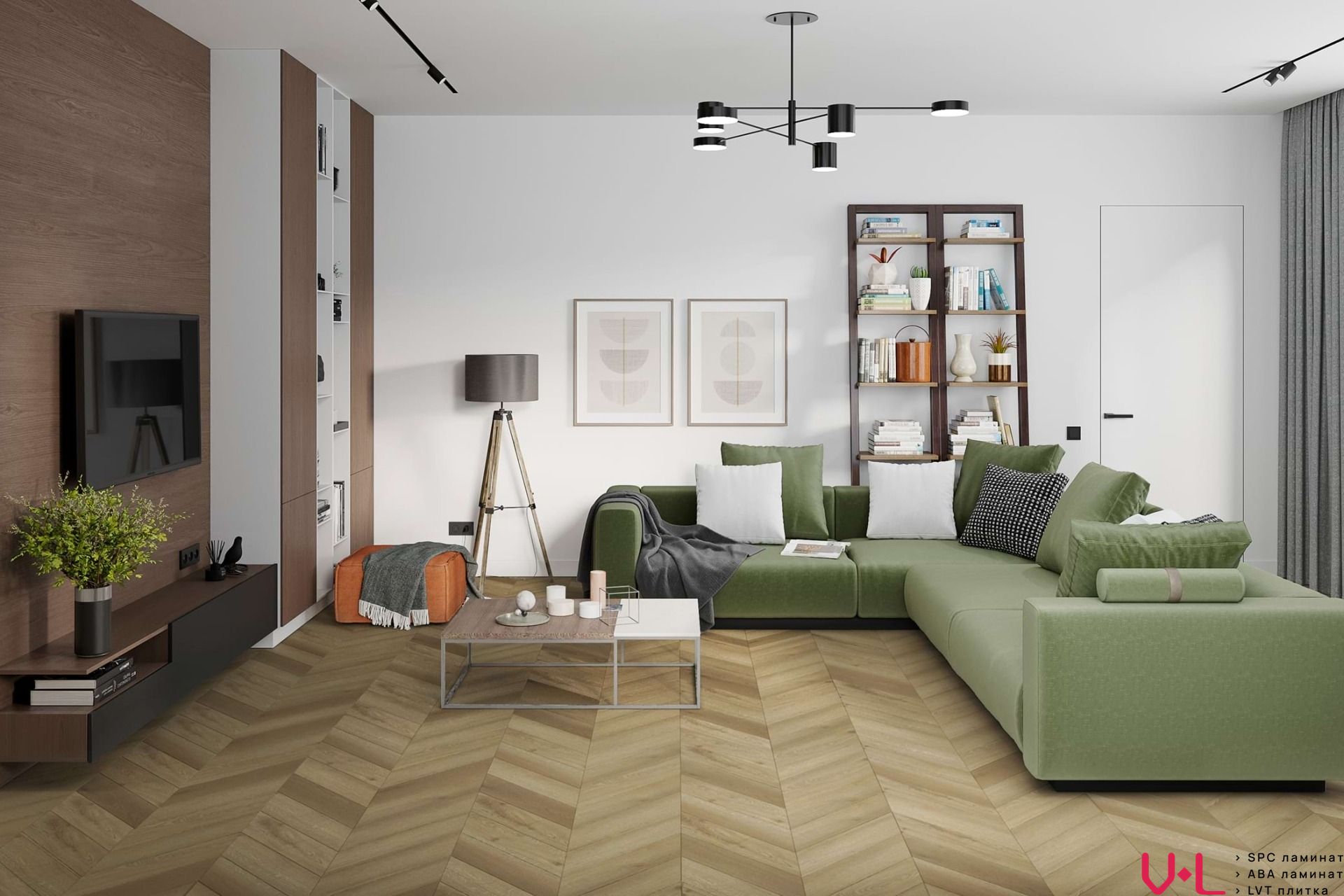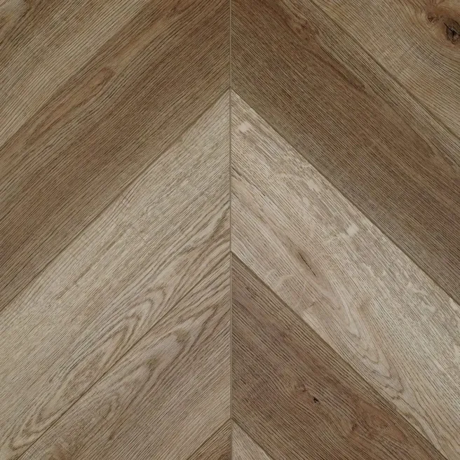 SPC ламинат имеет 43 класс износостойкости, что делает его подходящим для использования в помещениях с высокой проходимостью. Коричневый цвет ламината создаёт уютную атмосферу и добавляет теплоты в интерьер. Дизайн в виде «ёлочки» позволяет создать оригинальный и стильный вид пола. С фаской ламинат выглядит как классический деревянный пол, но обладает прочностью и долговечностью SPC покрытия. Синхронное тиснение обеспечивает идеальное совпадение рисунка и текстуры, создавая эффект натурального дерева.
