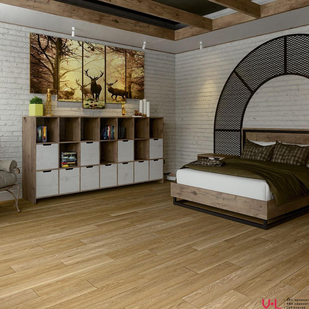 Насыщенный медово-золотистый оттенок с выразительной текстурой натурального дуба придает помещению солнечное настроение и визуальную глубину. Элегантный декор с тонкой прорисовкой древесных волокон делает этот пол универсальным элементом дизайна, который гармонично впишется как в классический, так и в современный интерьер.
