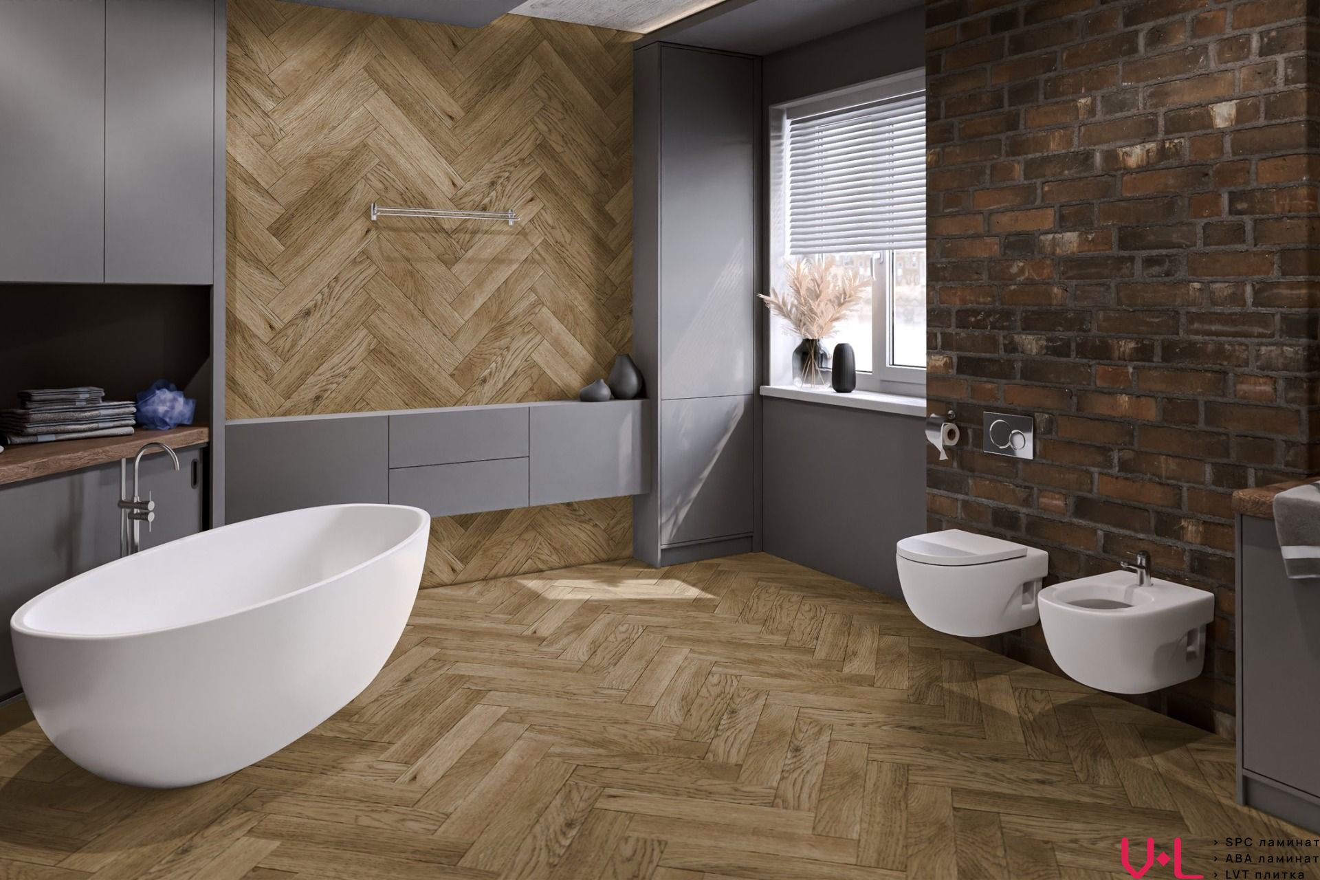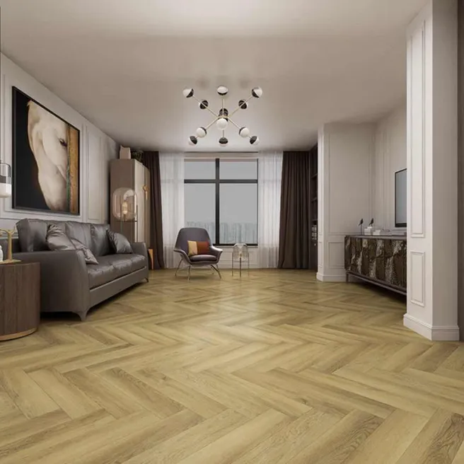 Плитка имеет реалистичный дизайн «ёлочка» тёмно-коричневого цвета с синхронным тиснением, что обеспечивает максимальное сходство с деревянным покрытием. Прочная и простая в укладке клеевая плитка может выдерживать температуру до +28 °C и совместима с тёплыми полами. Срок гарантии от производителя составляет 25 лет.