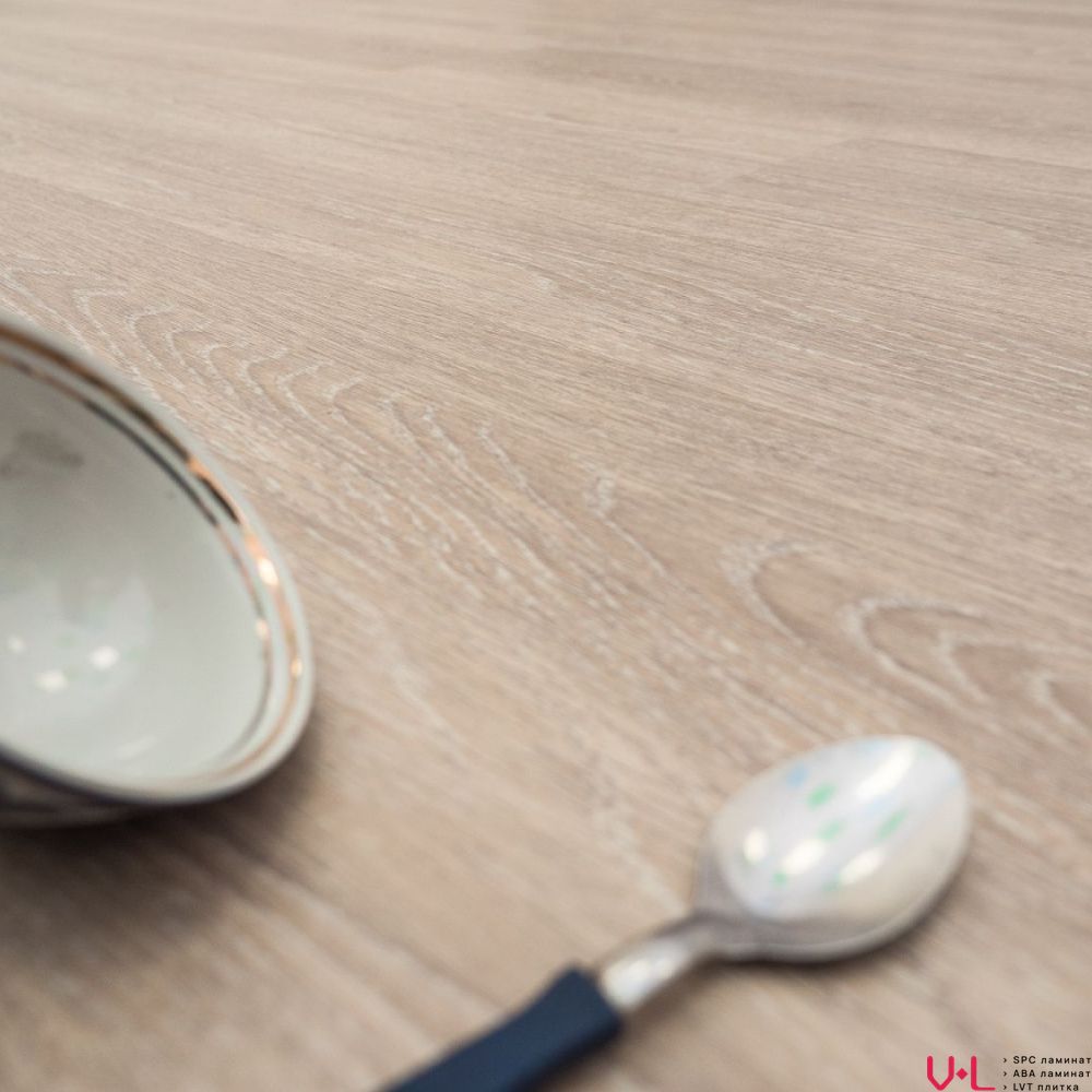 Плитка имеет бежевый цвет и дизайн под дерево с породой дуба. Это создаёт натуральный внешний вид, который придаёт помещению теплоту и уют. Материал обладает полной водостойкостью, что позволяет использовать его в помещениях с повышенной влажностью без опасений за его сохранность.