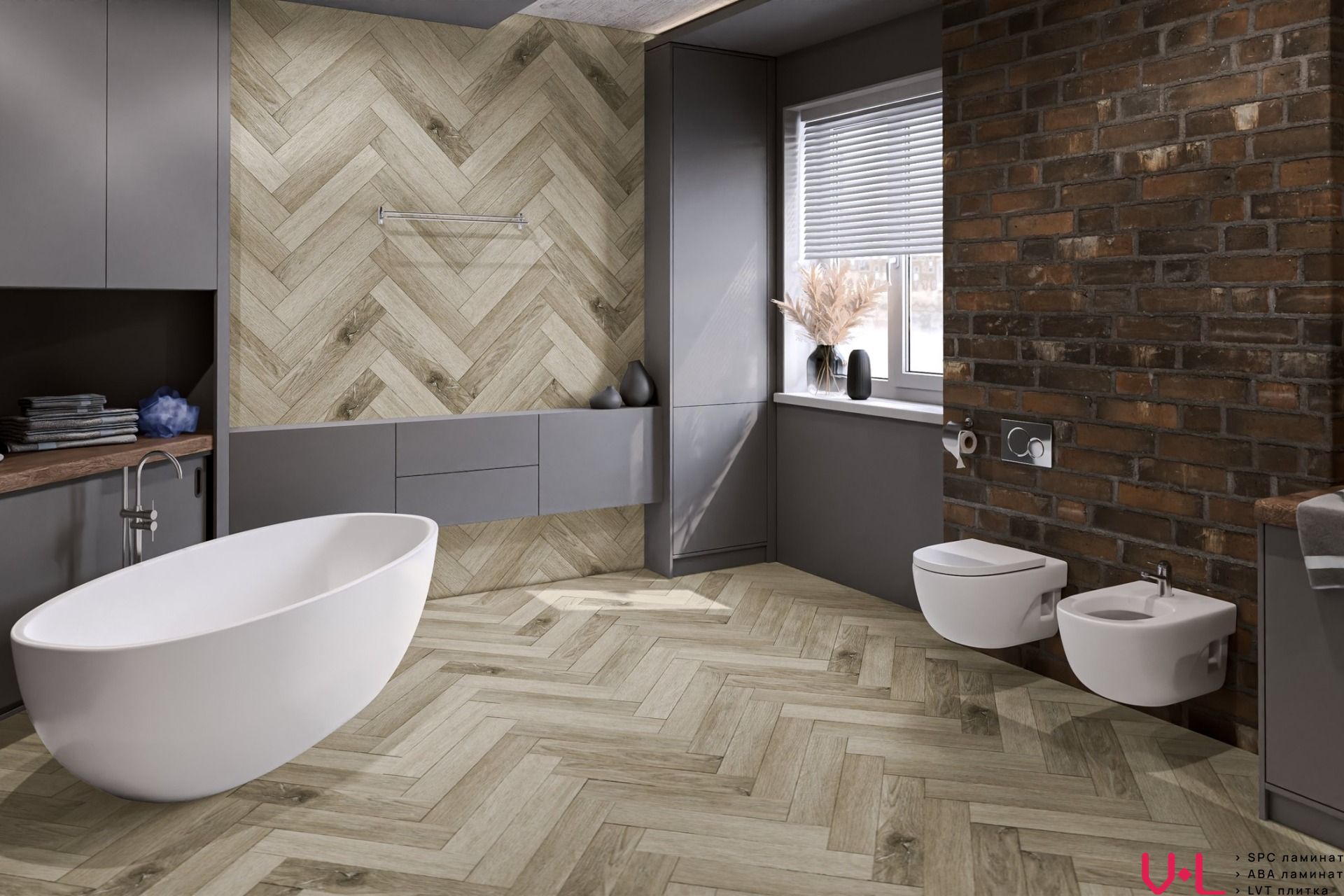 Дизайн плитки выполнен в виде ёлочки, что придаёт помещению изысканный и элегантный вид. Бежевый цвет покрытия хорошо сочетается с различными стилями интерьера и создаёт уютную атмосферу в помещении. Синхронное тиснение поверхности обеспечивает идеальное совпадение рисунка и текстуры, делая покрытие ещё более привлекательным.