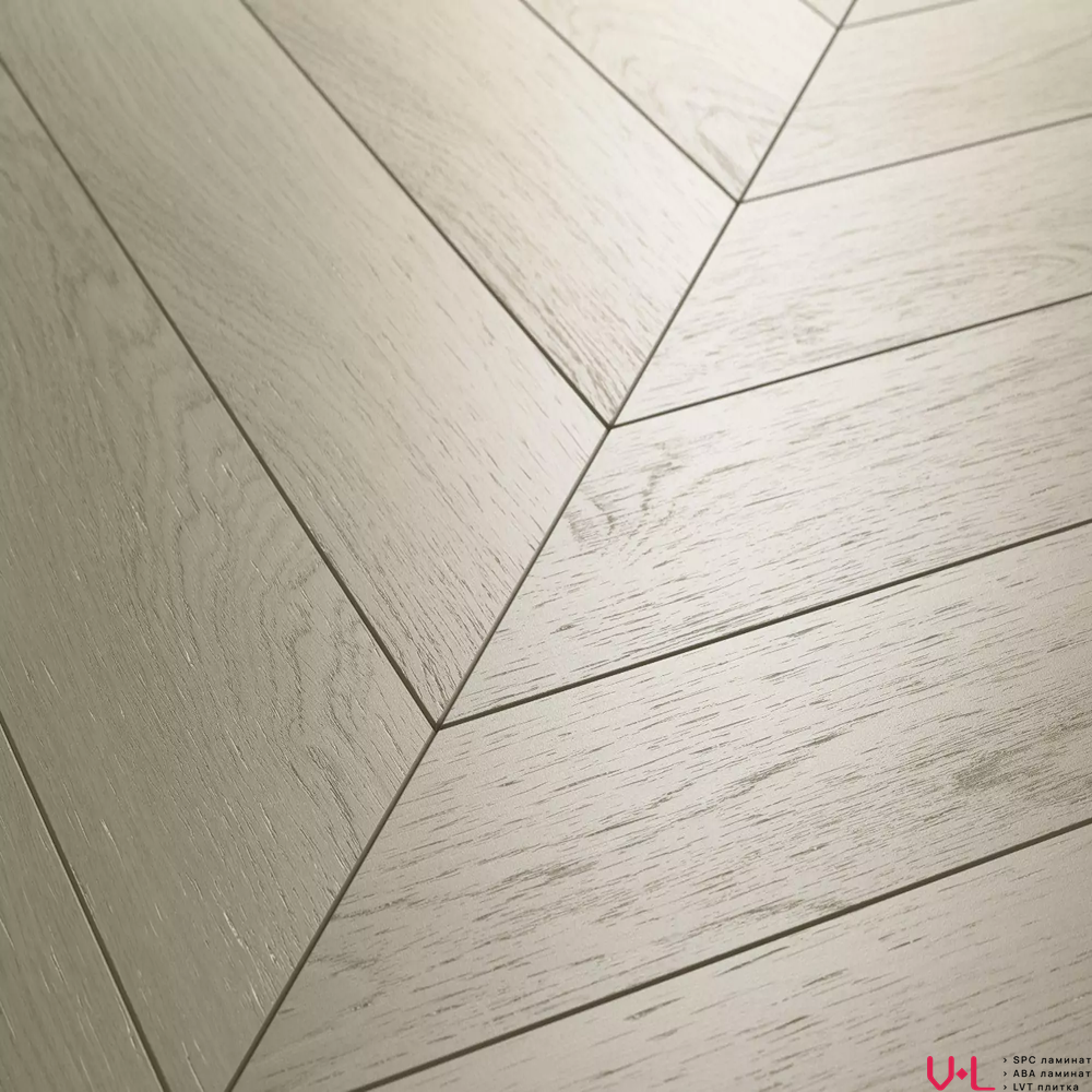 Дизайн «ёлочка» смотрится элегантно и привлекательно, а цвет, имитирующий дуб, идеально сочетается с любым интерьером. Благодаря фаске по периметру досок покрытие напоминает классический паркет. Ламинат совместим с системой подогрева пола до +28°C.