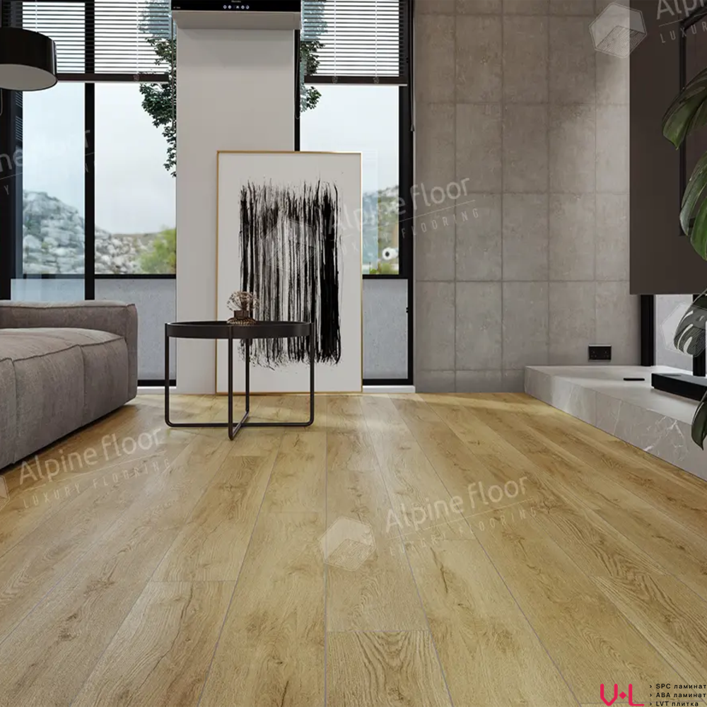 Толщина ламината составляет 4 мм, что позволяет ему эффективно справляться с повседневными нагрузками и сохранять привлекательный внешний вид на протяжении многих лет. Покрытие имеет класс износостойкости 43, что указывает на его способность выдерживать высокие нагрузки. Благодаря этому, SPC-ламинат Alpine Floor отлично подойдёт не только для жилых помещений, но и для коммерческих пространств с высокой проходимостью.