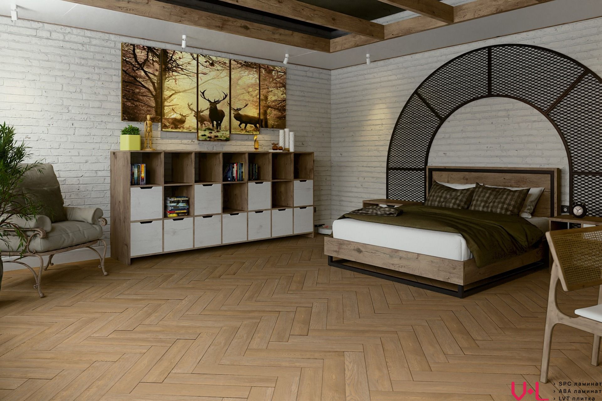 Дизайн коллекции вдохновлен классической английской «ёлочкой» — символом безупречного вкуса и элегантности. Такой рисунок придает интерьеру благородство и отлично вписывается как в классический, так и в современный стиль. Технология синхронного тиснения повторяет текстуру натурального дерева, создавая полное визуальное и тактильное сходство. По периметру каждой доски выполнена фаска, которая подчеркивает геометрию рисунка «ёлочки» и придает полу завершенный и респектабельный вид.