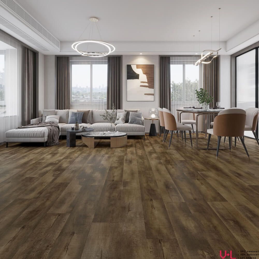 Ламинат выполнен в формате елочки, имеет бесфасочный дизайн и структуру поверхности с синхронным тиснением, что делает его визуально похожим на натуральное дерево. Толщина доски составляет 4,2 мм, а класс износостойкости — 42. Такие характеристики обеспечивают долговечность и надёжность покрытия. SPC-ламинат обладает полной водостойкостью, что позволяет использовать его даже в ванной комнате. При этом максимальная температура подогрева пола не должна превышать +28 °C.