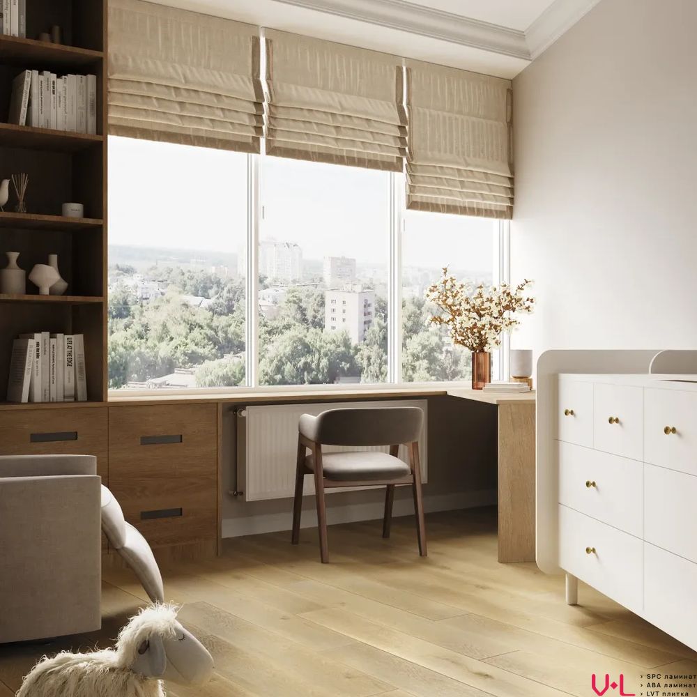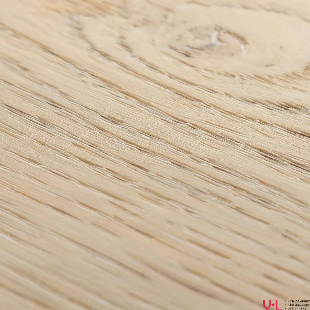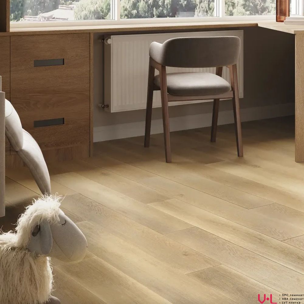 - Аутентичная фактура состаренного дерева: Поверхность ламината обладает выразительным рельефом и мягкой матовостью, которые тактильно и визуально неотличимы от натуральной древесины. Теплый бежевый оттенок создает в интерьере атмосферу уюта, света и благородной простоты, лишенную холодного искусственного блеска.