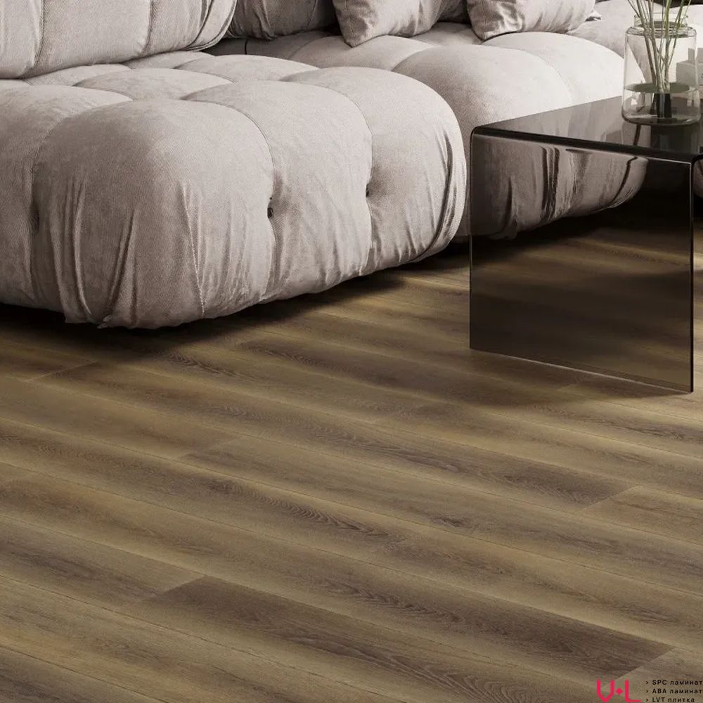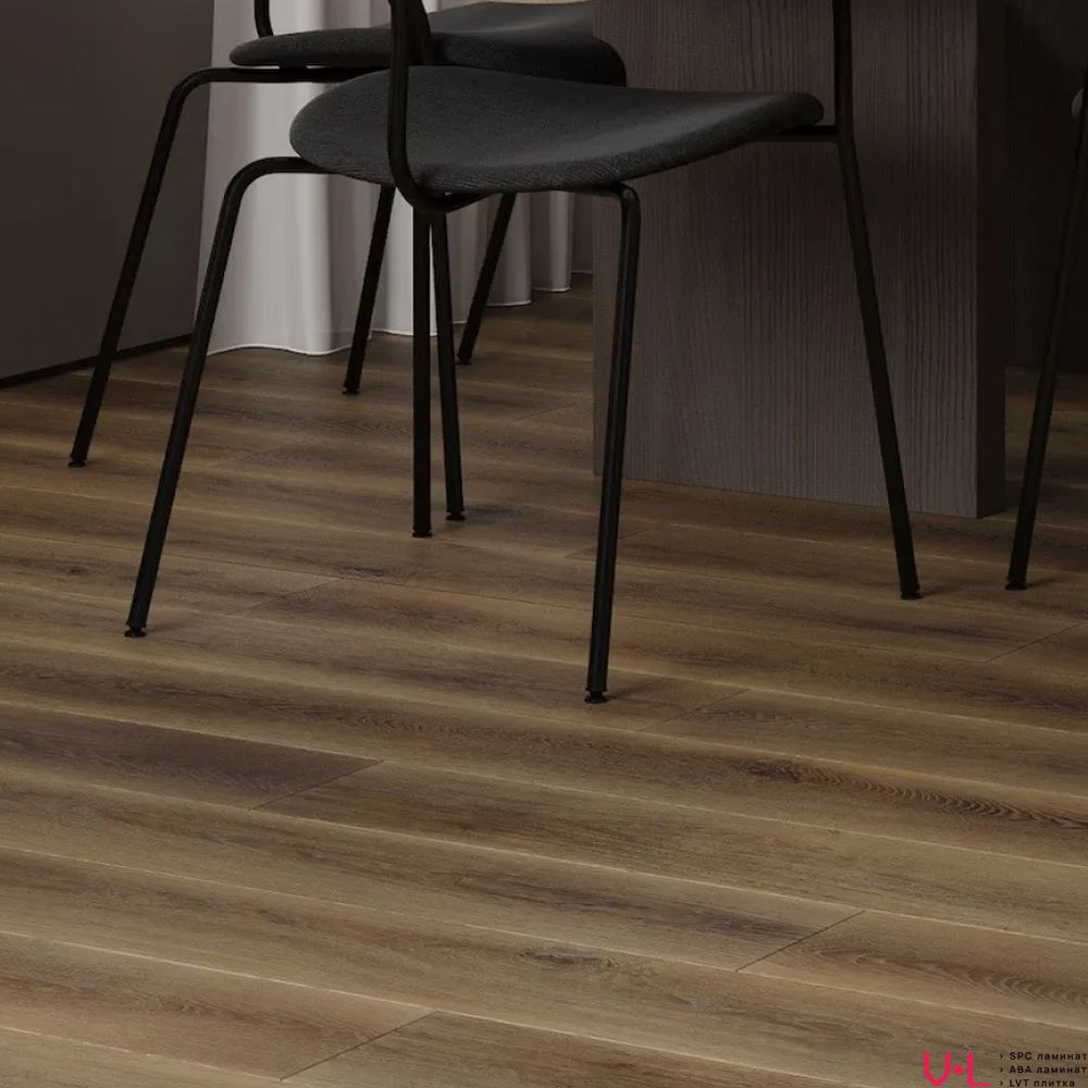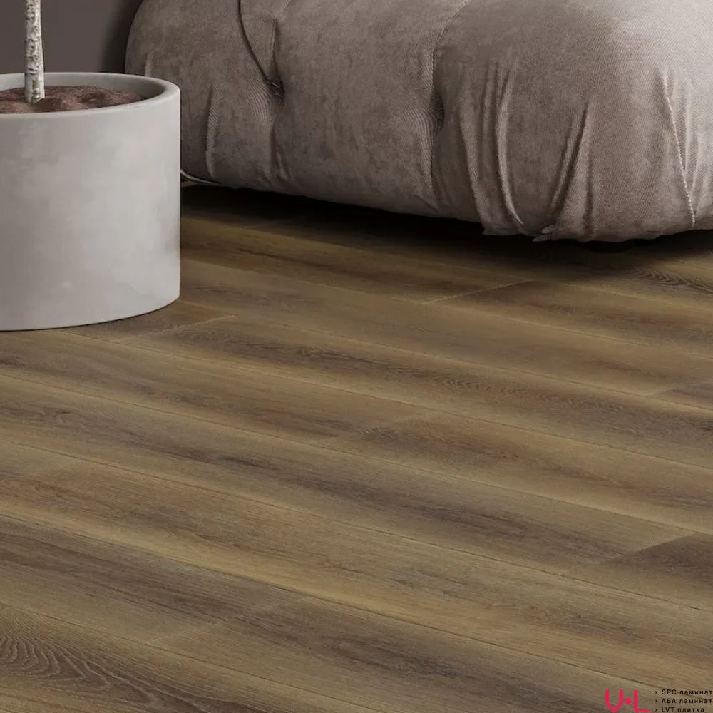 - Живая матовая фактура: Ламинат обладает поверхностью с естественной матовостью, которая тактильно и визуально передает всю глубину текстуры настоящего дерева. Теплый коричневый оттенок создает невероятно уютную и благородную атмосферу, лишенную холодного искусственного глянца.